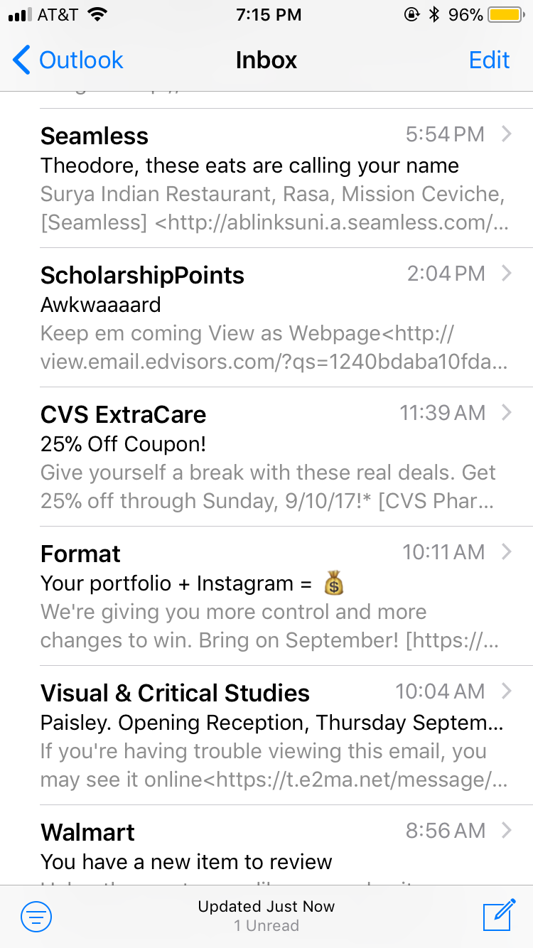 However, I've notice d a trend when I use it: I don't open two-thirds of the messages I receive. I simply swipe and tap to mark as read. Now, I know that I could just unsubscribe to most of these messages, but I don't. Whether it's because I'm afraid I'm going to miss that 25% off coupon for CVS or I'm just lazy, I don't know. But I rarely ever unsubscribe. I kind of like having notifications when I open the app. It makes me feel a little less lonely. But after swipe, tap, swipe, tap, swipe, tap, my fondness of these 27 unread messages goes away.